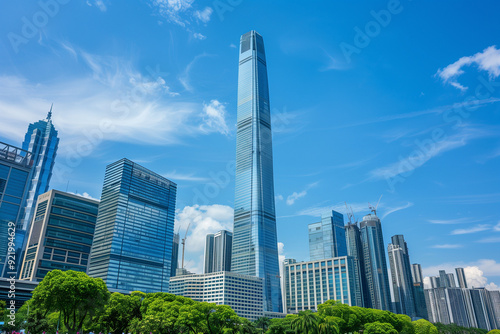 skyscraper, blue skies, white cloud, architecture, building, city landscape, urban, skyline, tower block, modern, perspective, looking up, tall building, city landscape, city, cloudscape, business building, downtown, real estate, exterior, corporate, metropolis, construction, business district, city architecture, aerial view, city life, outdoors, day, clouded sky, modern architecture, city view, business, urban development