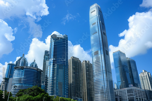 skyscraper, blue skies, white cloud, architecture, building, city landscape, urban, skyline, tower block, modern, perspective, looking up, tall building, city landscape, city, cloudscape, business building, downtown, real estate, exterior, corporate, metropolis, construction, business district, city architecture, aerial view, city life, outdoors, day, clouded sky, modern architecture, city view, business, urban development