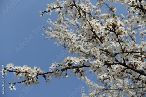 Slanted branch of blossoming Prunus cerasifera tree against blue sky