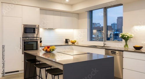 Sleek and modern kitchen interior with a central island, integrated appliances, and a beautiful view of the city skyline at twilight