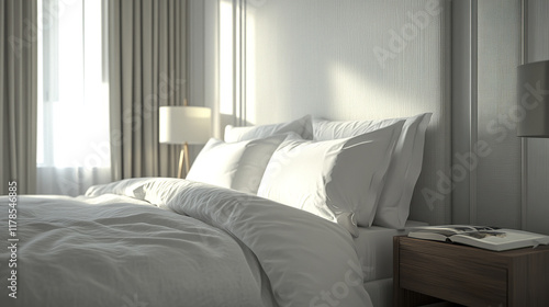 bedchamber, white, bedding, soft, texture, wooden, nightstand, lamp, curtain, sunlight, cosy, modern, interior, design, relaxation, comfort, pillow, sheet, minimalistic, elegant, serene, peaceful, home, decor, stylish, contemporary, tranquil, inviting, restful, clean