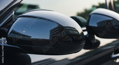 Sleek Black Car Mirror Reflecting Building and Sky