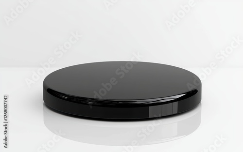 Sleek black podium with glossy reflections, isolated on white