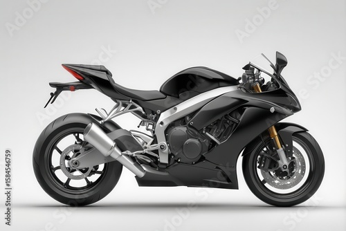 Sleek black sport motorcycle with silver accents showcased on a plain background. Fast and powerful.