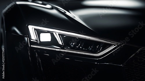 car, automobile, vehicle, sport, luxury, headlamp, black, dark, sleek, design, modern, futuristic, technology, automotive, detail, close, up, glossy, shiny, chrome, light, bright, intense, powerful, speed, performance, engine, grill, front, bumper, elegant, sharp, line, curve, sophisticated, aesthetic, image, photo, style, concept, shadow, contrast, texture