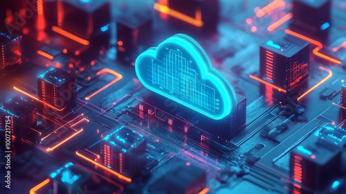 Sleek Cloud Computing Concept with Glowing Blue Cloud Icon and Neon Pathways