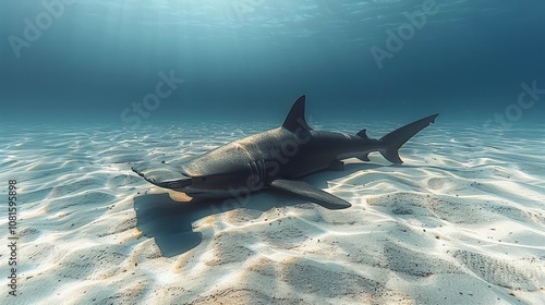 Sleek hammerhead shark patrolling the ocean floor, casting a shadow over the sandy seabed, with soft light from above.