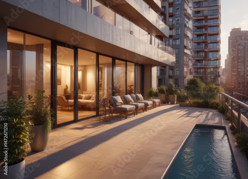 Sleek high-rise apartment bathed in warm evening sunlight, showcasing expansive balcony , interior architecture, luxury home, luxury condo