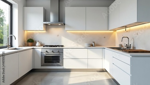 Sleek, minimalist modern kitchen with stainless steel appliances and white cabinetry , minimalist kitchen, marble
