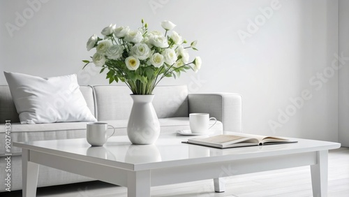 Sleek modern coffee table with crisp white magazine against minimalist white background and elegant decorative vase with fresh flowers.
