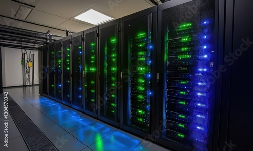 sleek, modern, server, room, row, glowing, blue, green, led, light, reflecting, polished, metallic, surface, computer, rack, center, hardware, database, networking, information, datacenter, system, mainframe, communication, web, connection, storage, hosting, technology, equipment, security, service, business, industry, cyberspace, datum