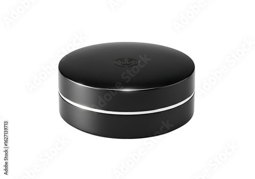 Sleek, round, black cosmetic container.