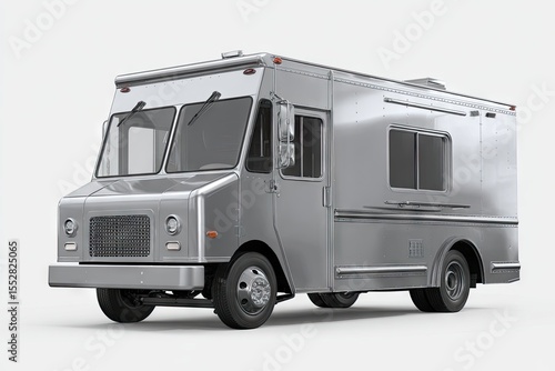 Sleek, silver food truck, angled view, showcasing a polished stainless steel exterior, small service window, and standard box truck chassis