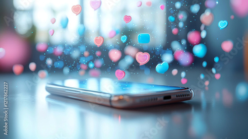 sleek smartphone sits on smooth surface surrounded floating social media notification bubbles portraying dynamic nature of digital interaction in today's society.