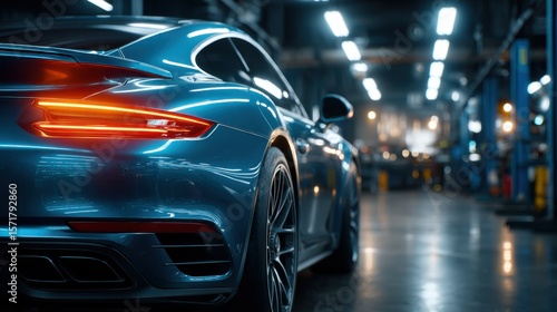 sport, car, luxury, high-end, auto, repair, shop, lighting, performance, design, gleaming, vehicle, exhaust, rear lamp, meticulous, care, garage, polish, shimmer, workshop, elegance, professional, service, transport, maintenance, automotive, premium, upscale, exquisite, speed, race, motorsport, modern, interior, floor, wet, shiny, technology, mechanic, craftsmanship, ambience, style, power, engine, aerodynamic, wheel, blue, sedan