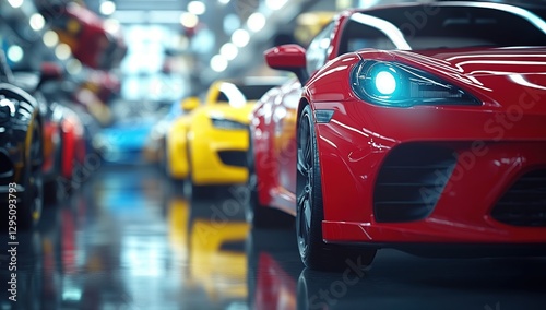 Sleek Sports Cars Showroom: Red Yellow Blue Vehicles