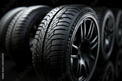 Sleek summer car tire collection on black, lit dramatically, shallow focus Generative AI