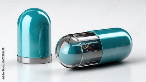 pill, capsule, medication, medicine, pharmaceutical, turquoise, teal, metallic, shiny, glossy, health care, treatment, remedy, prescription, drug, supplement, vitamin, medicals, rounded, smooth, modern, clean, minimal, simple, professional, clinical, health, wellness, therapy, healing, transparent, reflective, closeup, studio, bright, sterile