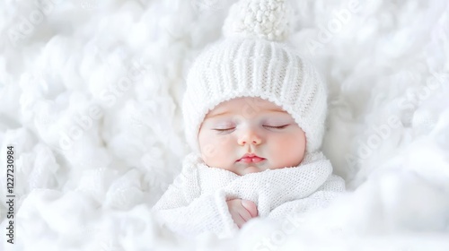 Sleeping baby in white knit hat, cozy blanket. Perfect for winter cards