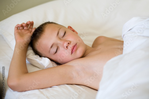 Sleeping boy in bed. Morning. Boy is nine years old.