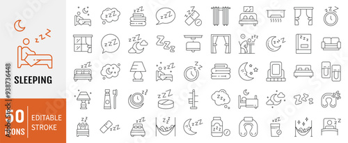 Sleeping icon set. Related to sleep, bedroom, dream, pillow, bed, alarm clock, insomnia, night and rest icons. Vector Illustration