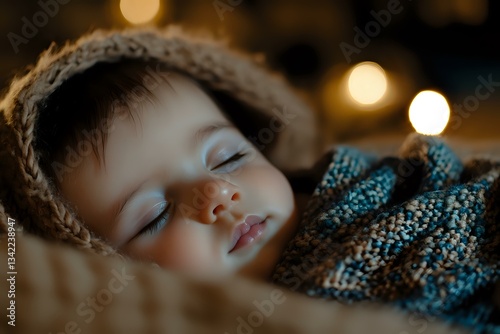 Sleeping toddler in knitted winter hat and sweater with bokeh lights in background, peaceful expression on face, warm cozy atmosphere for childhood concepts.