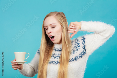 Sleepy woman holding cup of coffee