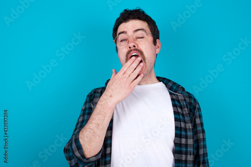 Sleepy young Caucasian man with moustache wearing plaid shirt against blue wall yawning with messy hair, feeling tired after sleepless night, yawning, covering mouth with palm.