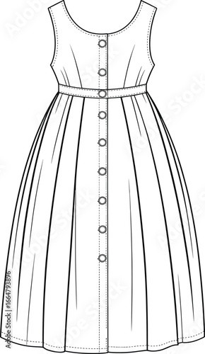 dress, technical, fashion, flat, vignetting, vector, illustration, apparel, clothing, woman, template, garment, textile, design, drawing, buttons, midi, sleeveless, pleated, technical drawing
