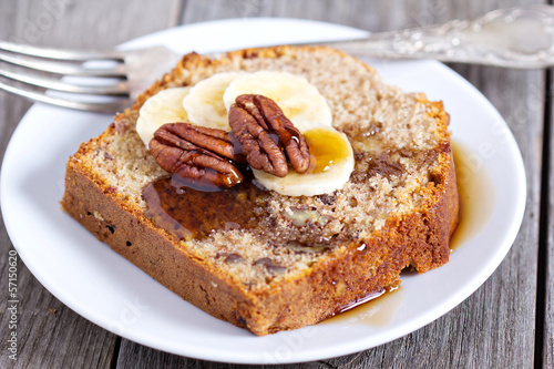 Slice of banana cake with pecans and maple syrup