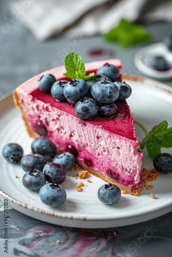 Slice of blueberry cheesecake with fresh blueberries and mint on a white plate
