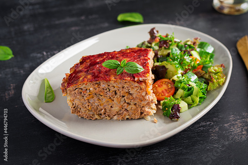 Slice of casserole with rice, minced beef meat and cabbage with tomatoes sauce on top decorated with basil on the plate