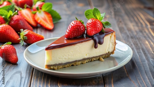 Slice of cheesecake with chocolate topping and fresh strawberries on top , dessert, bakery, sweet, delicious, creamy