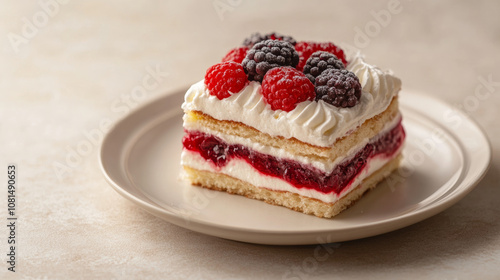 Slice of French cream cake fashion raspberry strawberry decor beige minimalism background. food photography advertising modern delicious atmosphere cute luxury wallpaper