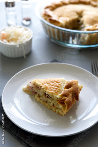 Slice of homemade sauerkraut pie on gray wooden table. Cabbage cake tradition russian food