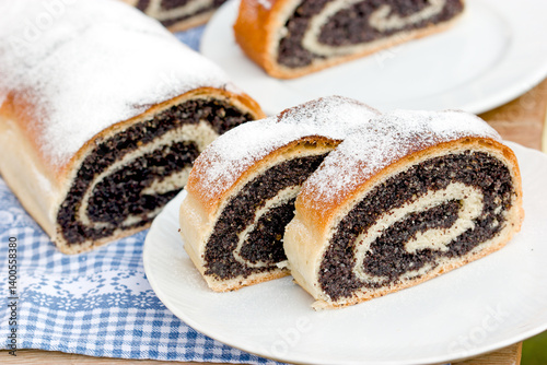 Slice of poppy seed strudel on plate, homemade poppy seed roll