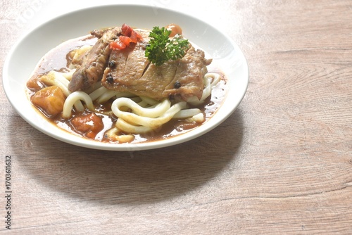 slice roasted chicken topping udon or Japanese rice noodles dressing potato and carrot in Japanese curry on plate