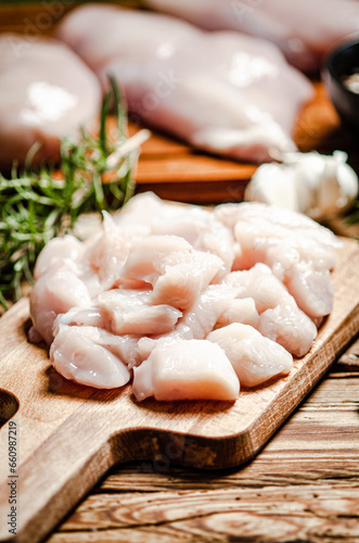 Sliced chicken fillet. On cutting board.
