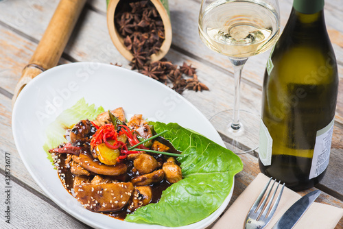 Sliced chicken fried in sweet and sour soy sauce with vegetables and herbs in a deep plate on a wooden table in a restaurant.