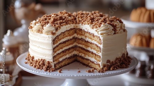 cake, layer, sliced, whipped cream, crumble, dessert, bakery, tiered, racked, food, background, cake, display, sweet, delicious, holiday, party, festive, autumn, fall, crumb, cream, portion, slice, baked goods, food photography, closeup, pastry, birthday, elegant, party food, event, wedding, celebration, layered, creamy, crumb, garnish, white, pastry, presentation, eatery
