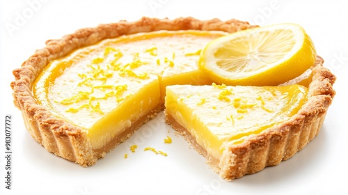 Sliced lemon tart with a golden crust, topped with fresh zest, isolated on a white background