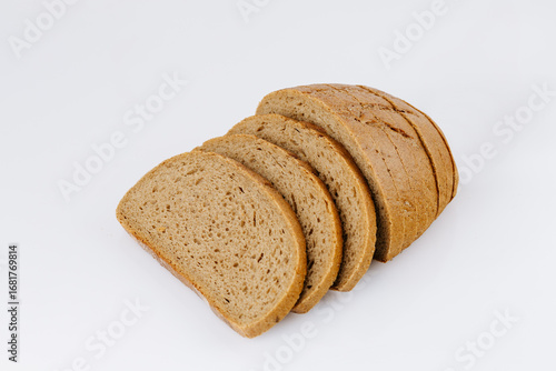 Sliced rye bread loaf isolated on white background, healthy whole grain bakery product
