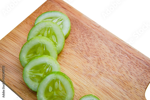 slices of fresh green cucumber on a cutting board. isolated white background. copyspaceslices of fresh green cucumber on a cutting board. isolated white background