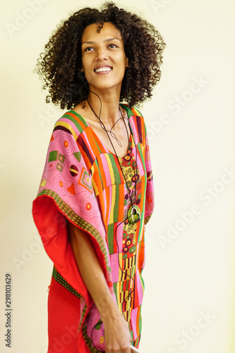 slim brown woman smiling with afro hair, white background freestyle