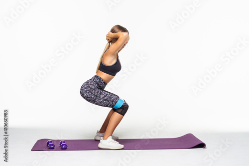 Slim woman doing squats with fitness loop band isolated on white background