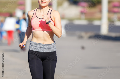 Slim woman running on the street in the morning. Healthy lifestyle background with jogging girl and copy space