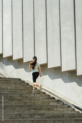 Slim woman with flying hair in tracksuit runs up large stone steps past wall with concrete plates on city street backside view