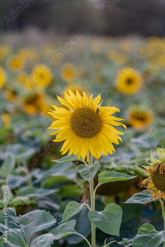 Słonecznik na polu słoneczników, żólte kwiaty w pełnym rozkwicie zbliżenie