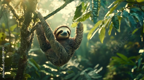 sloth, rainforest, jungle, tree, tree branch, leaf, mammal, wildlife, animal, nature, sun, sunlight, green, tropical, forest, hanging, slow, cute, lazy, fur, wild, exotic, creature, arboreal, vegetation, environment, ecosystem, biodiversity, conservation, photo, image, picture, background, scene, fauna, flora, habitat, summer, day, light, shadow, mossy, climbing