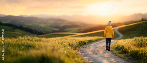 slow living routine lifestyle and new beginning concept. Cinematic shot of a person standing at the beginning of the trail. connect to the solitude, inner peace theme.